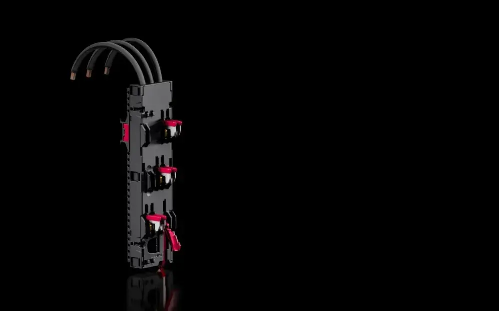 RiLineX Geräteadapter (80 A, 3-polig, inkl. Anschlussleitungen) in Breite 54 mm für 60 mm Sammelschienensysteme. Mit montierter, werkzeuglos verstellbarer Tragschiene zur Aufrastmontage der Geräte