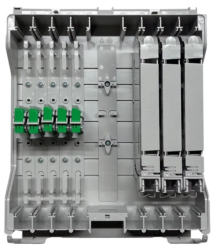 fiberway Wandspleißbox M, vorbereitet für bis zu 9 Wohnungen mit Spleißkassetten, Adaptern und Halterungen, Pigtails, Ordnungssystemen und Zubehör als DPN in Anlehnung an EN50700